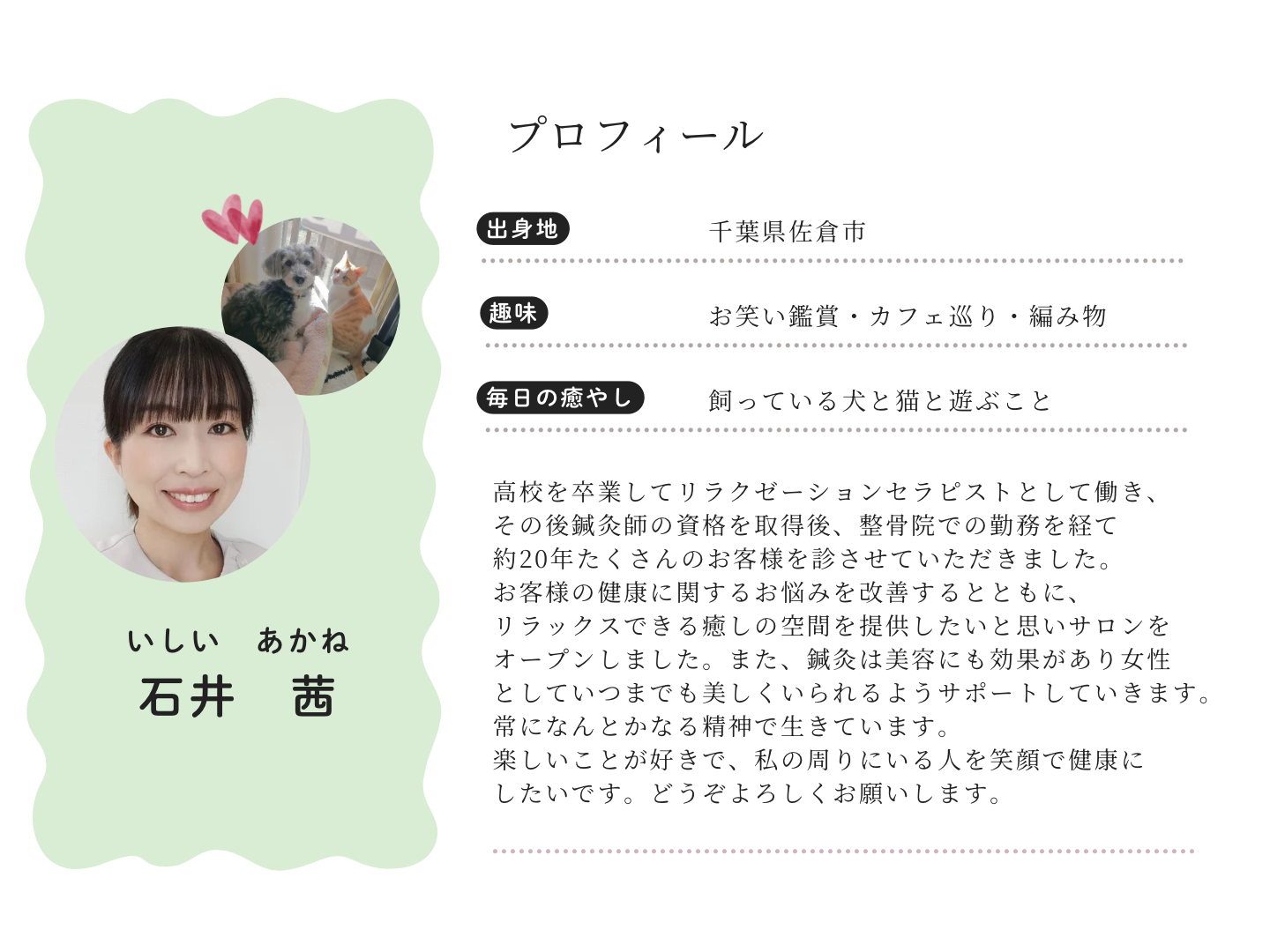 店舗案内 店舗名 エレナ鍼灸サロン 代表 石井 茜 所在地 〒285-0855 千葉県佐倉市井野 1467−16 電話番号 070-3312-1804 営業時間 10:00~20:00 定休日 火曜日+不定休 駐車場 1台(サロン敷地内にあります) アクセスマップ 『勝田台駅方面からのアクセス(詳細)』はこちらをクリック 『志津駅方面からのアクセス(詳細)』はこちらをクリック